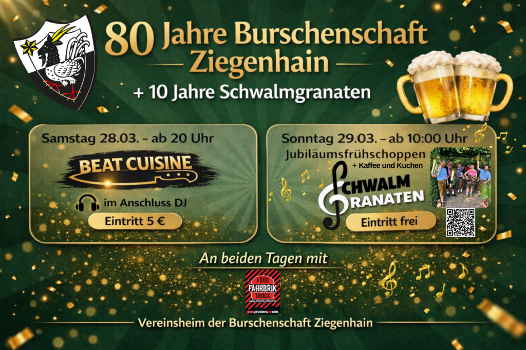 Nach ihrem Ziegenhainer Debüt beim 70-jährigen Jubiläum der Burschenschaft Ziegenhain stehen die Schwalmgranaten seit nunmehr zehn Jahren als sechsköpfige Blasmusik-Combo im Oberkrainer- / Alpenland-Stil für Stimmung und Unterhaltung mit Lederhos´ und Blech. Das wollen wir feiern und zwar gleich doppelt: 10 Jahre Schwalmgranaten und 80 Jahre Ziegenhainer Burschenschaft – kommt vorbei zum Jubiläumsfrühschoppen am 29. März ab 10 Uhr im Vereinsheim der Burschenschaft Ziegenhain!